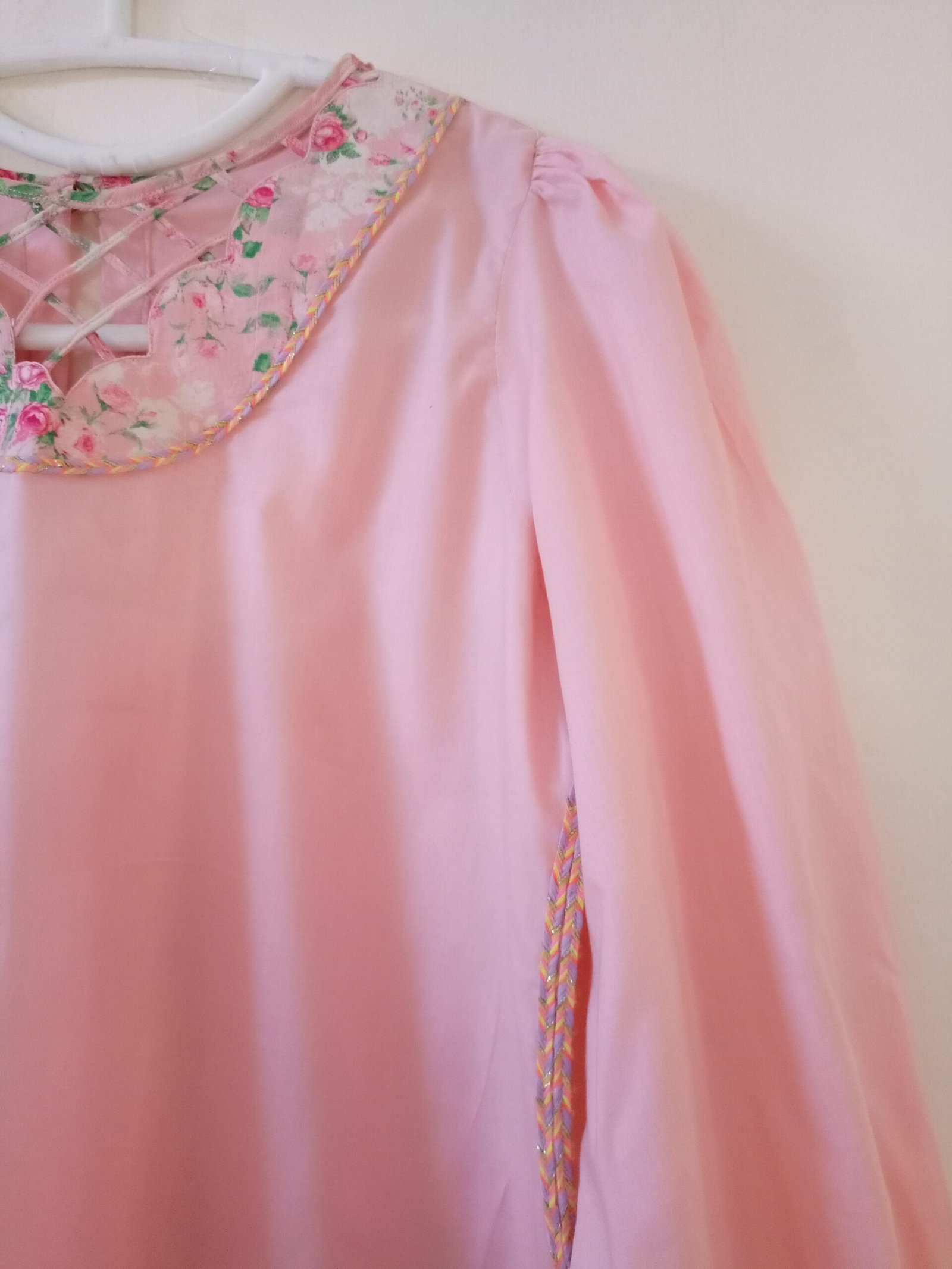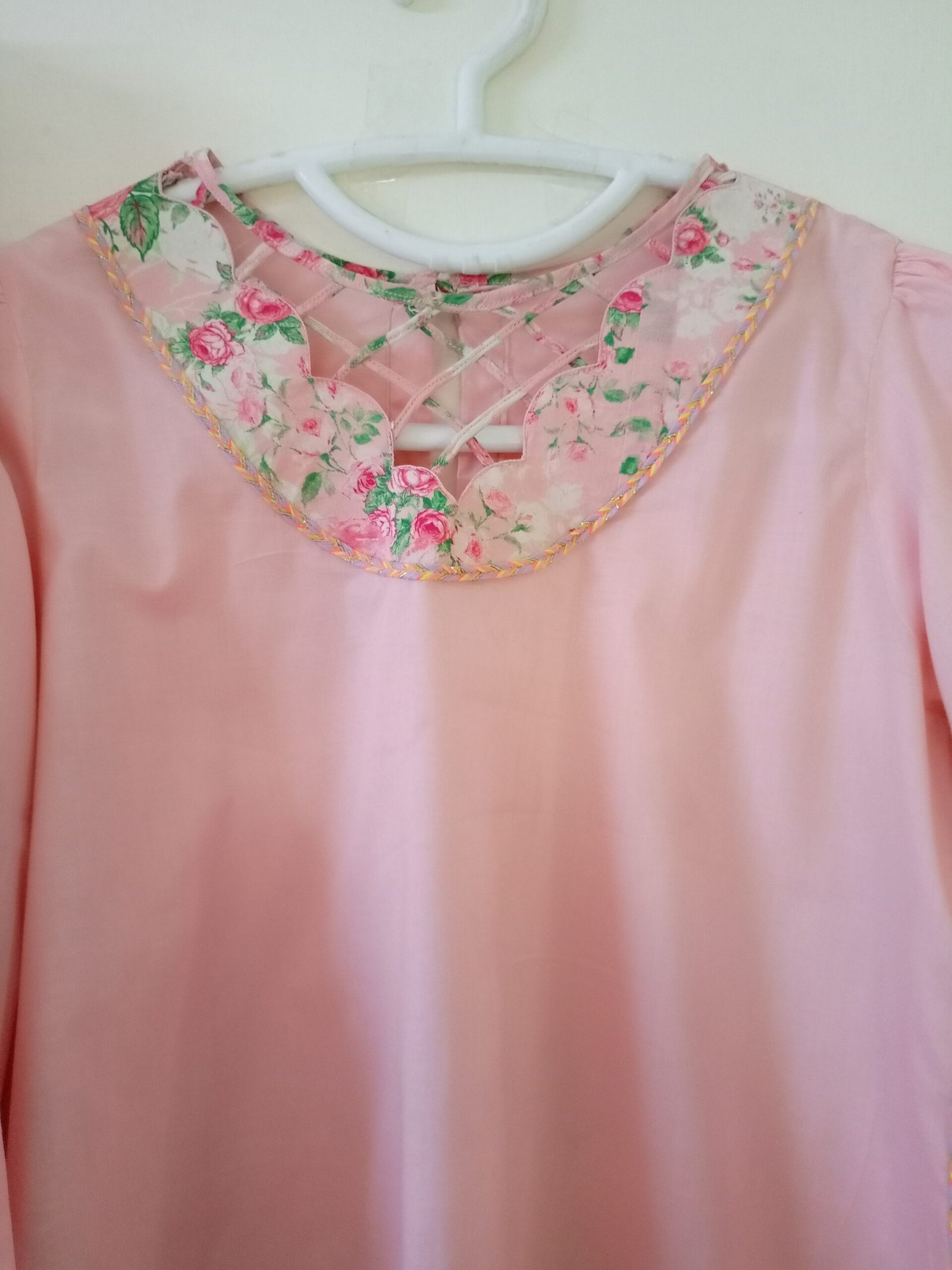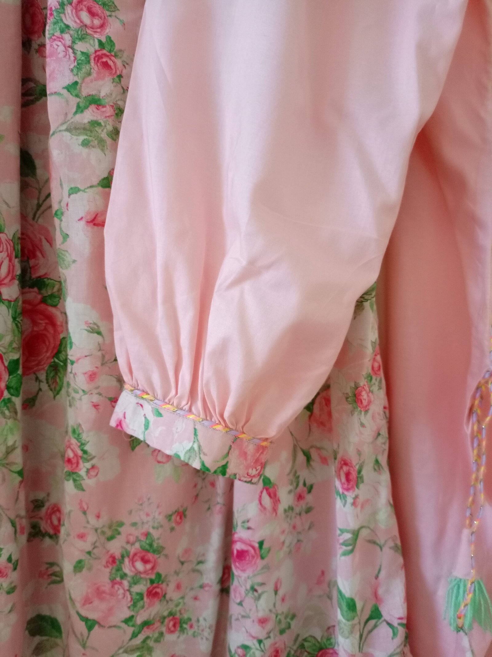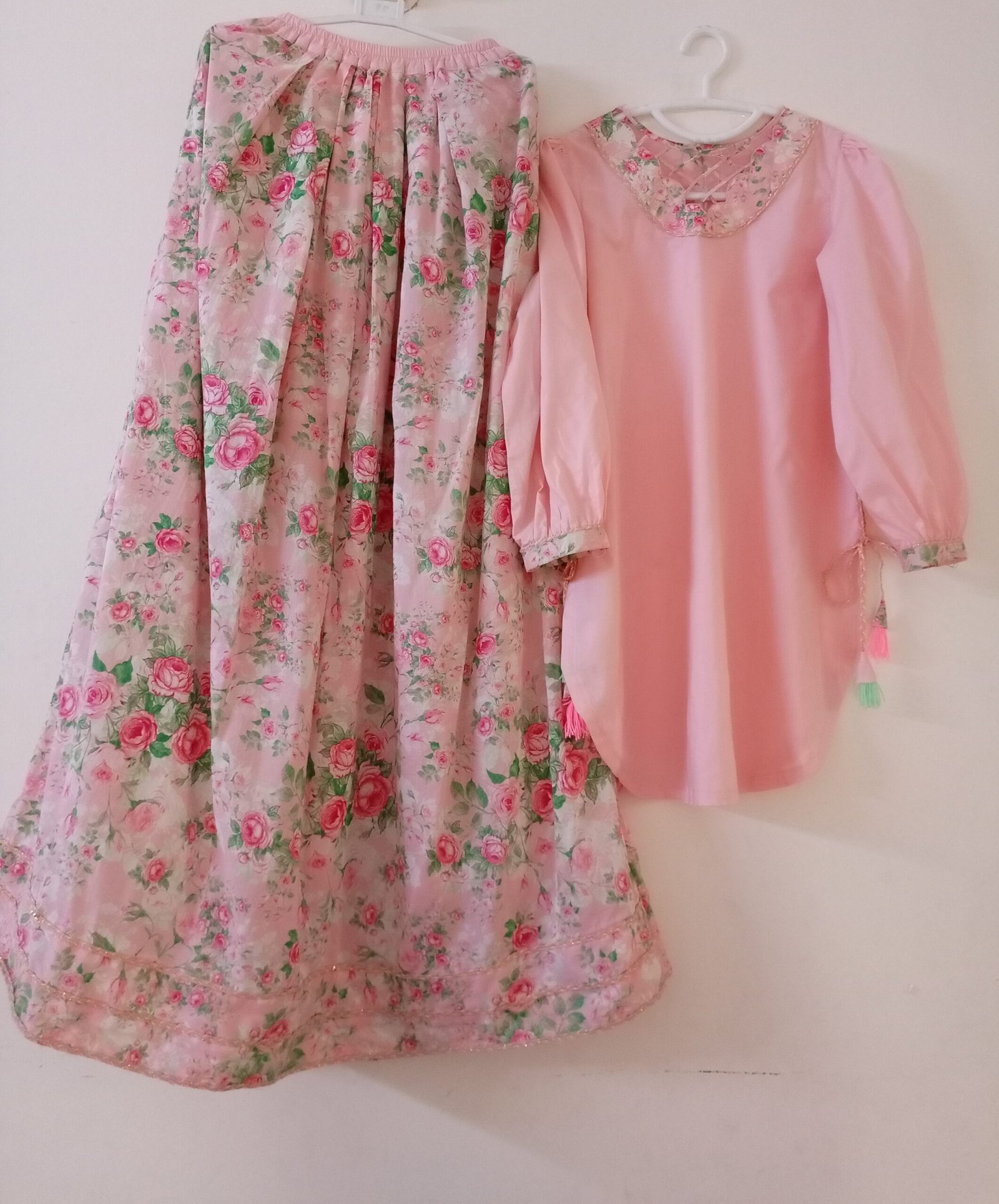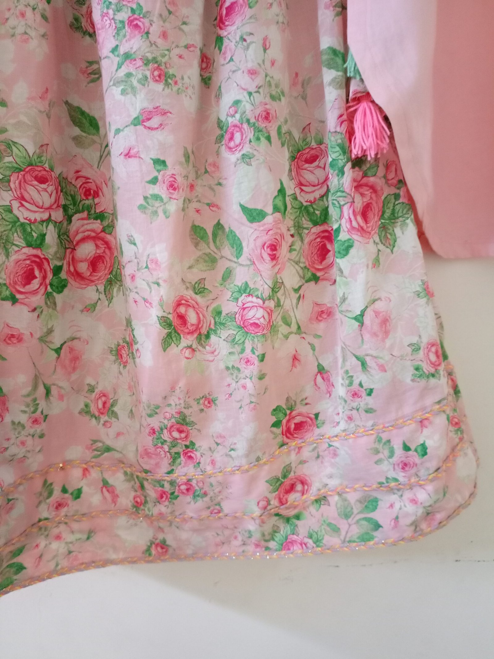 This elegant two-piece dress set features a soft pastel pink top and a floral print skirt, blending traditional charm with modern design. The top is crafted from plain pink fabric, adorned with a scalloped floral neckline and intricate criss-cross lace detailing, adding a delicate and feminine touch. The side tie-up includes playful tassels in coordinating colors. The matching skirt is made of light, translucent fabric with an all-over rose print in shades of pink and green, further embellished with glittery accents and braided piping for added texture and shine. The elastic waistband ensures a comfortable fit, making it suitable for casual and semi-formal occasions.