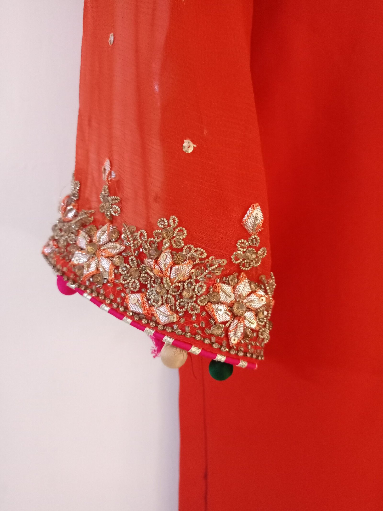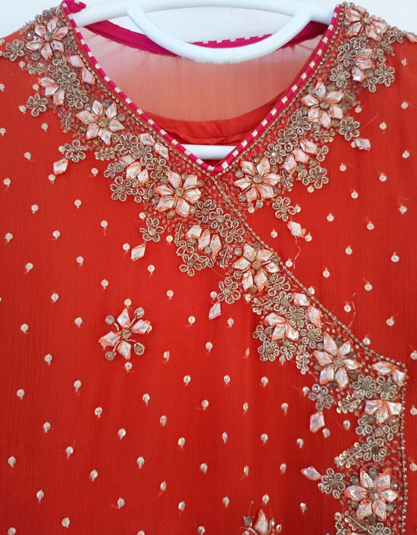 - Fabric: Likely georgette or chiffon for the coat and dupatta, with a matching inner layer for coverage.
