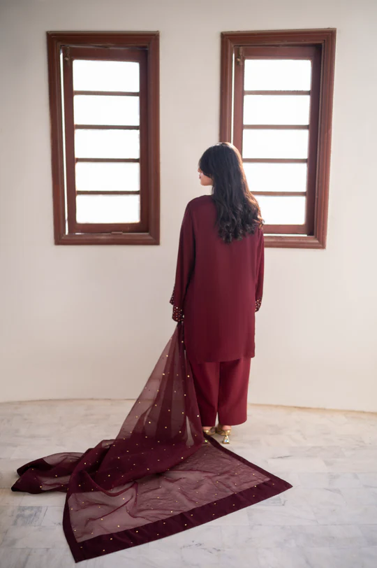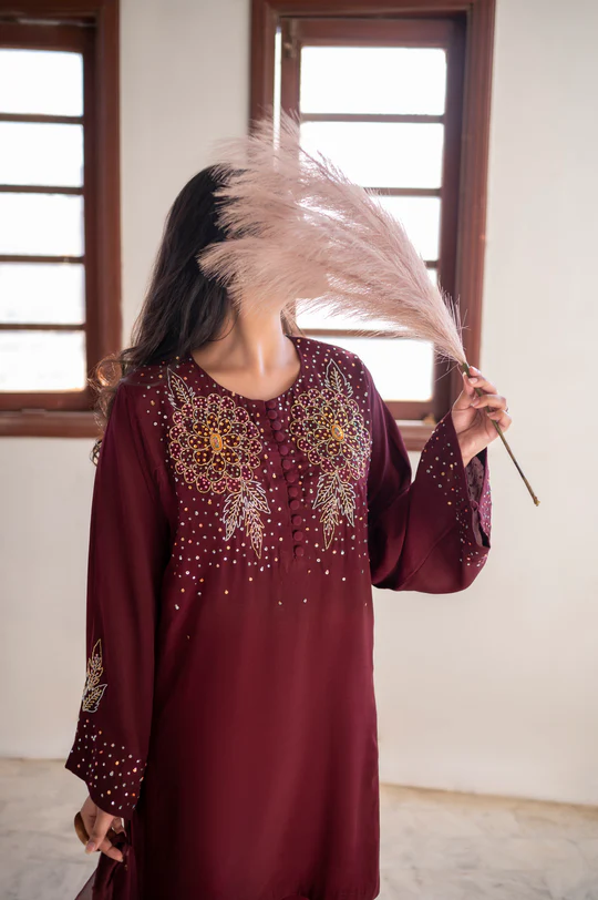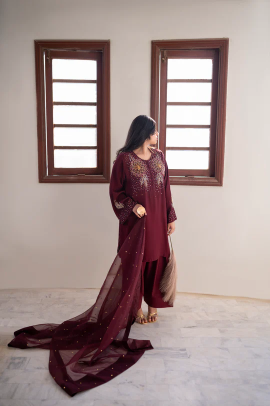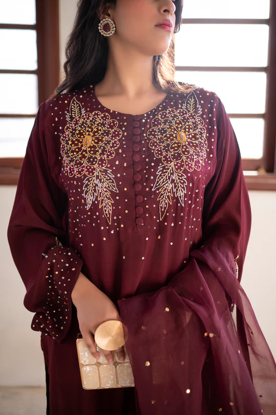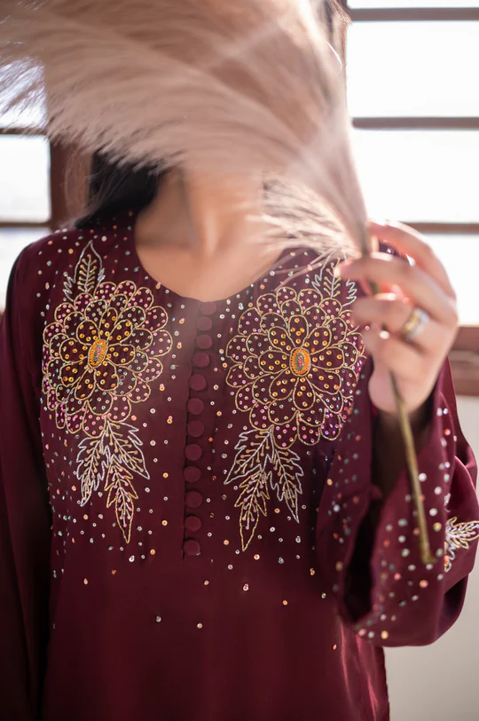 This stunning deep purple burgundy shirt is heavily embellished with intricate work on the round neckline, featuring stylish loop buttons. The embellished bell sleeves add a dramatic flair, while the Farshi shalwar and organza dupatta with a delicate chan spray complete the look, making it perfect for any special occasion.