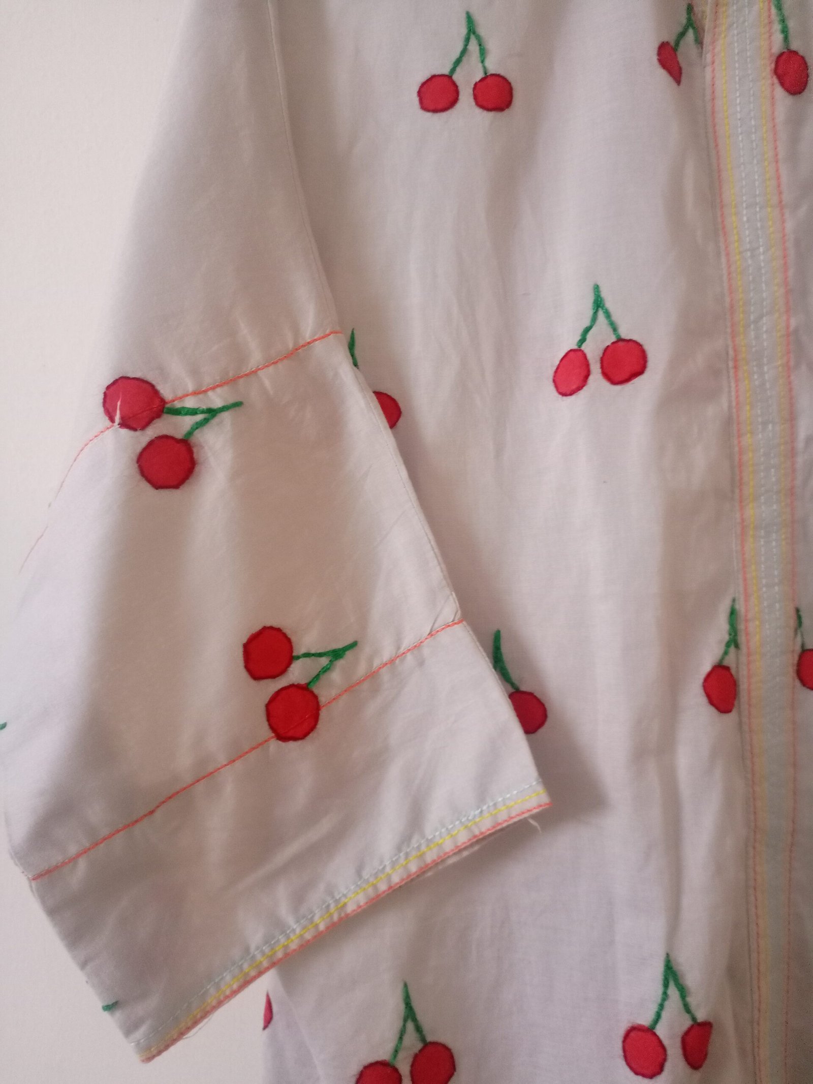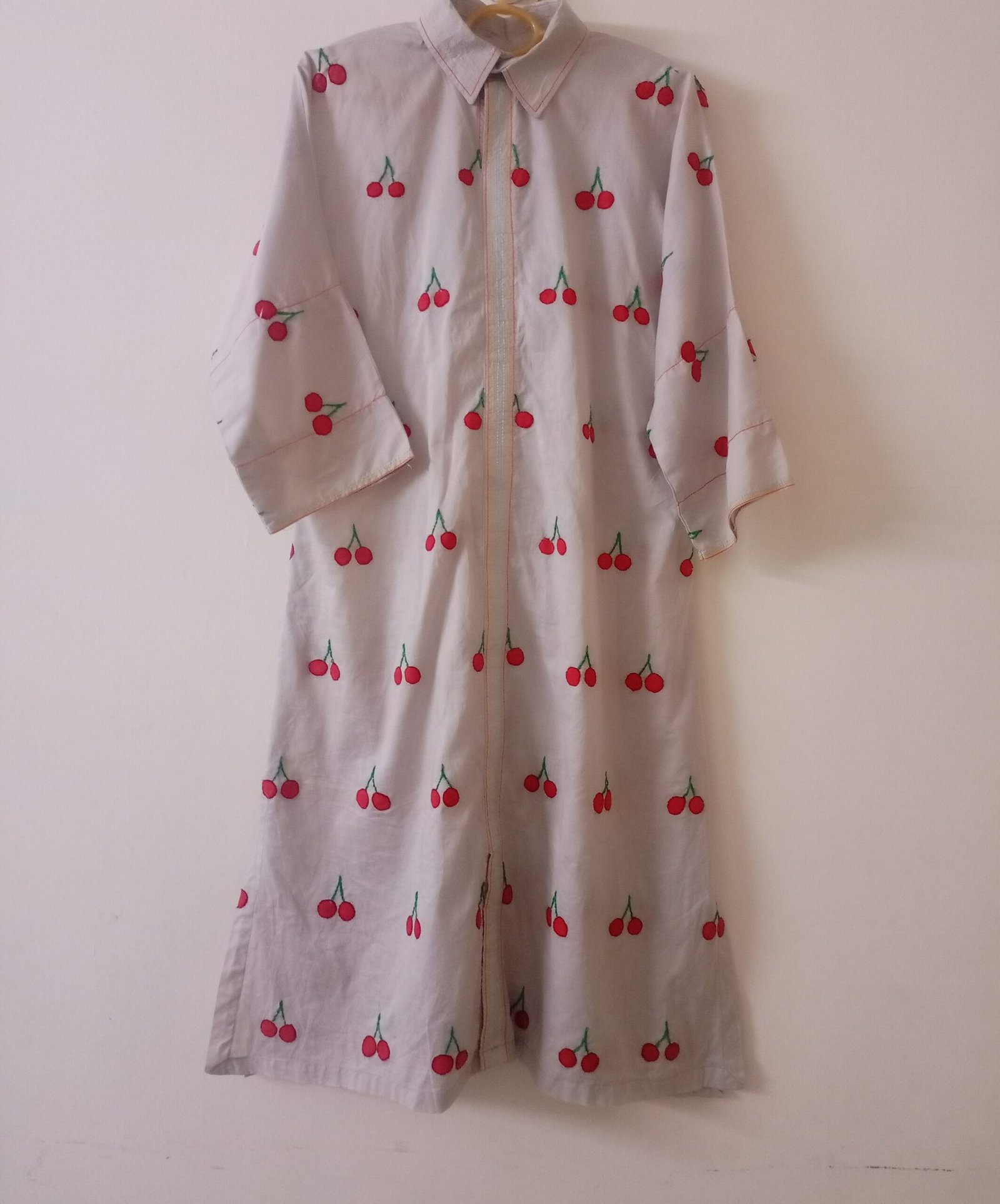 Add a playful charm to your wardrobe with this delightful hand-painted and hand-embroidered dress. Crafted from soft, breathable fabric, the dress features an all-over cherry motif — each pair of cherries meticulously hand-painted and accented with fine hand embroidery. The vibrant red fruit pops beautifully against the subtle grey base, while delicate green stems add a refreshing contrast. Finished with multi-colored stitch detailing along the front placket and sleeve hems, this relaxed-fit dress brings together artistry and comfort, making it perfect for casual outings or creative gatherings.