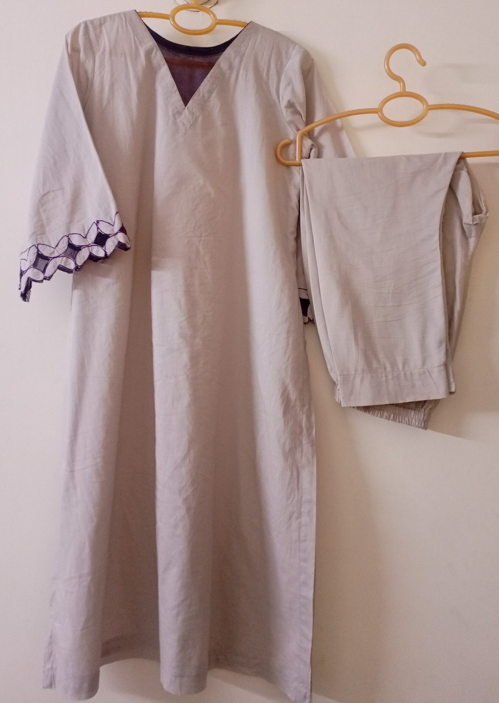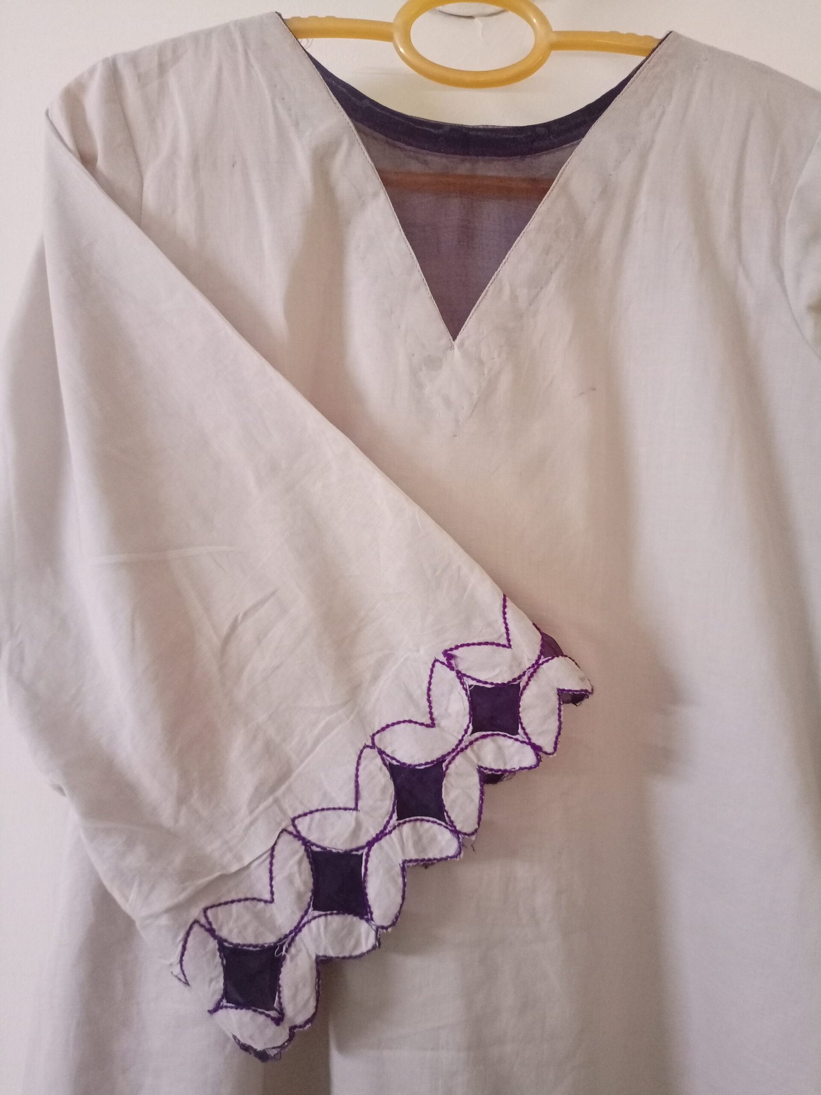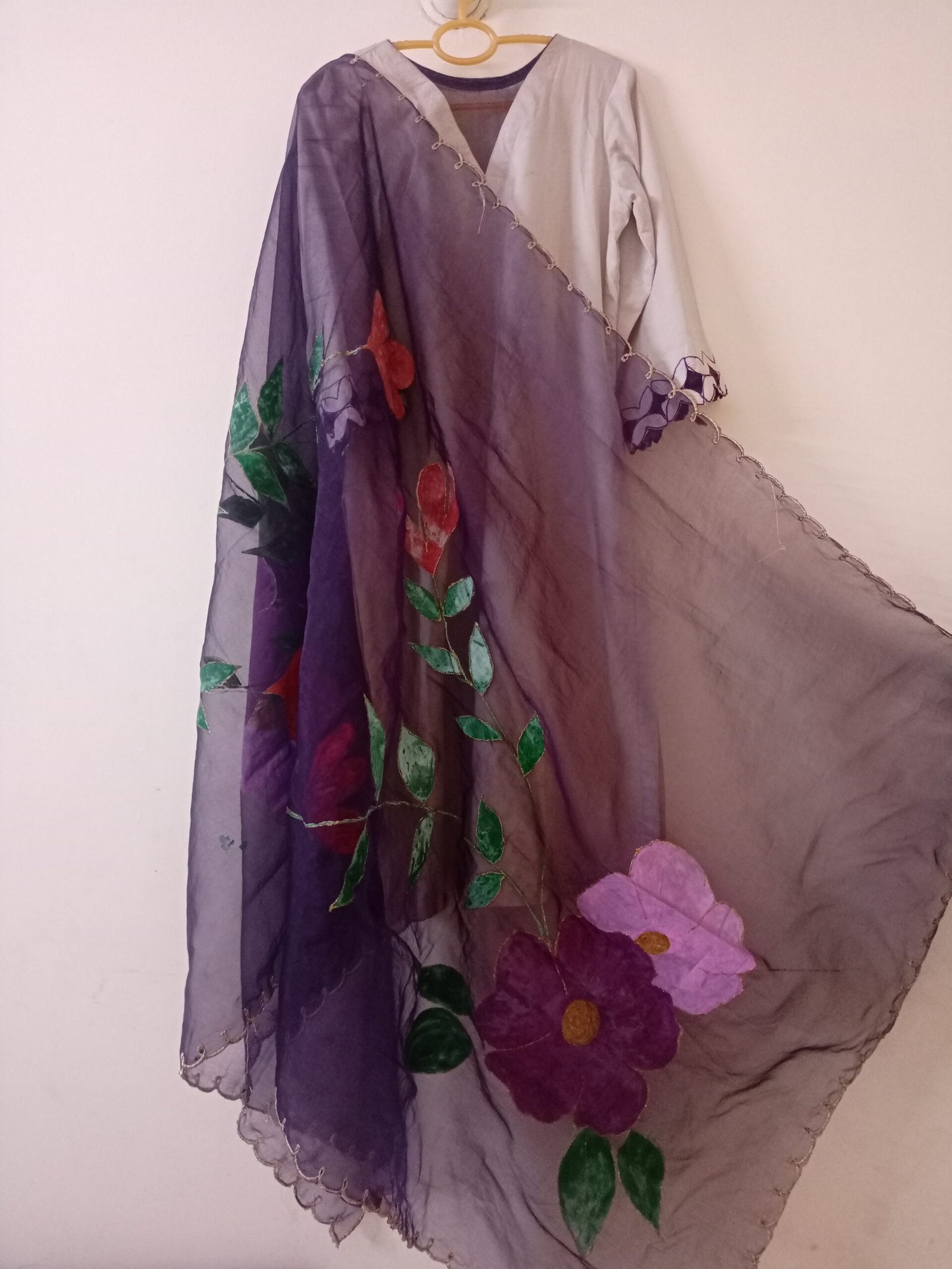 - Bell-style sleeves with intricate purple and grey floral cutwork embroidery