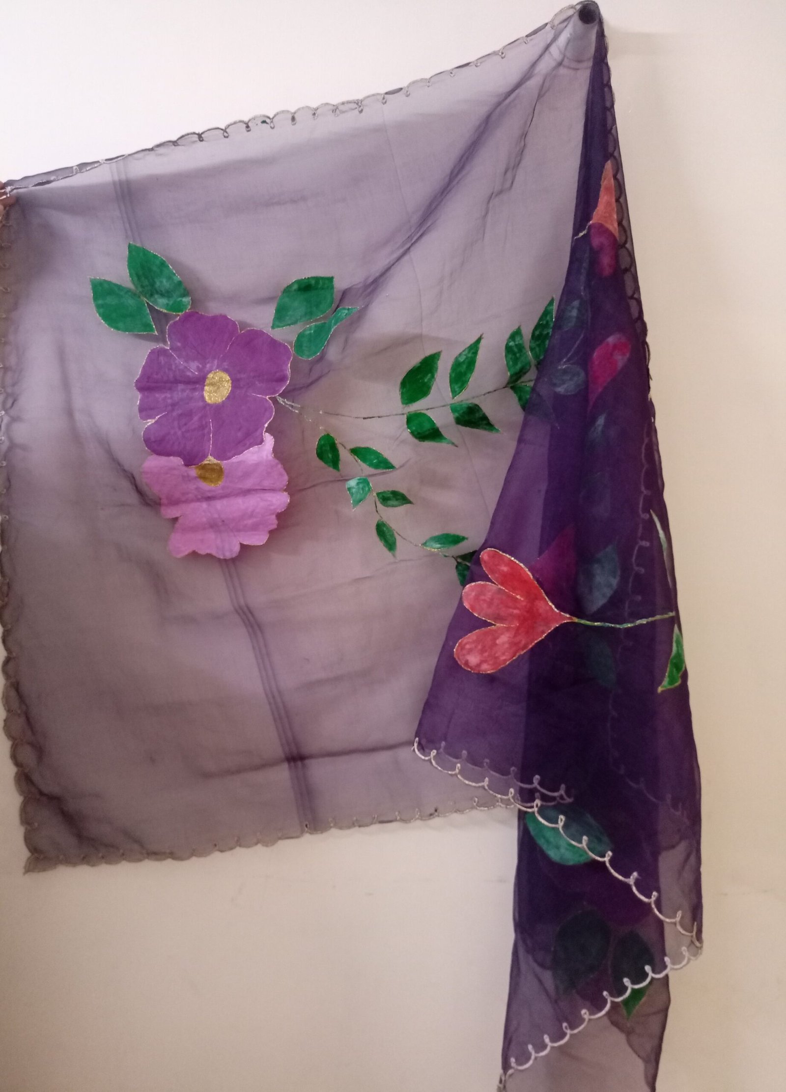 - Hand-painted large floral designs in pink, purple, red, and green