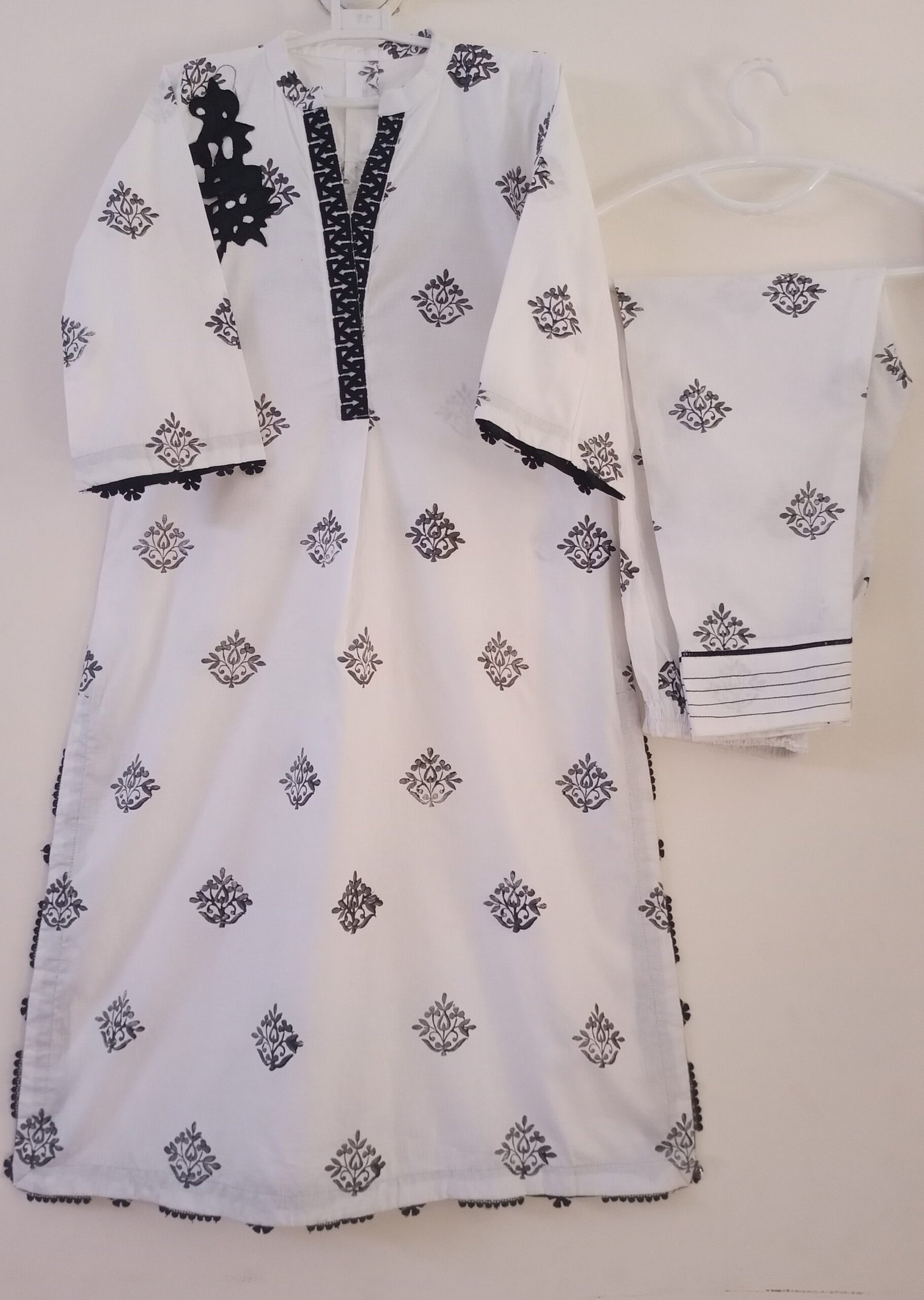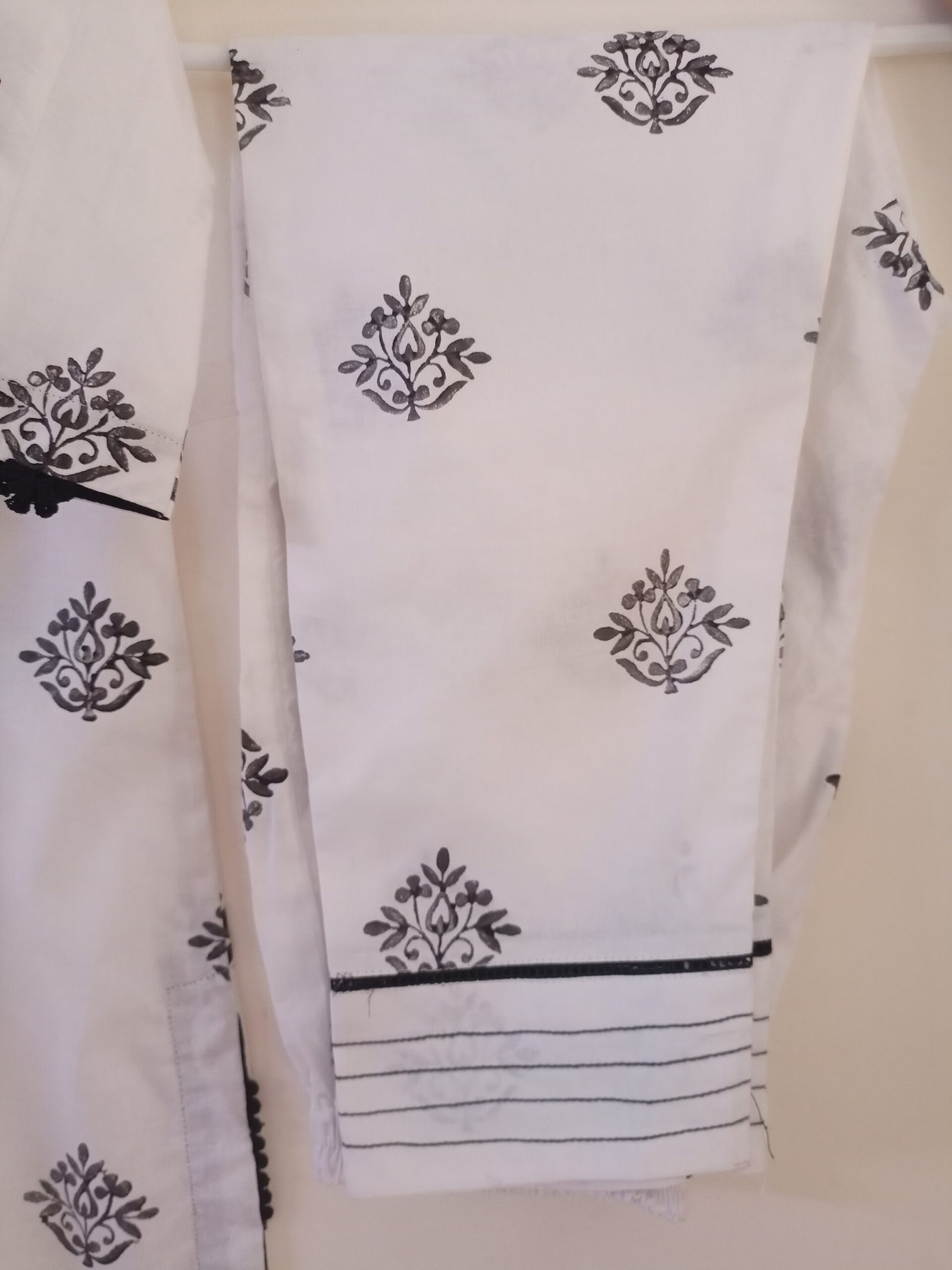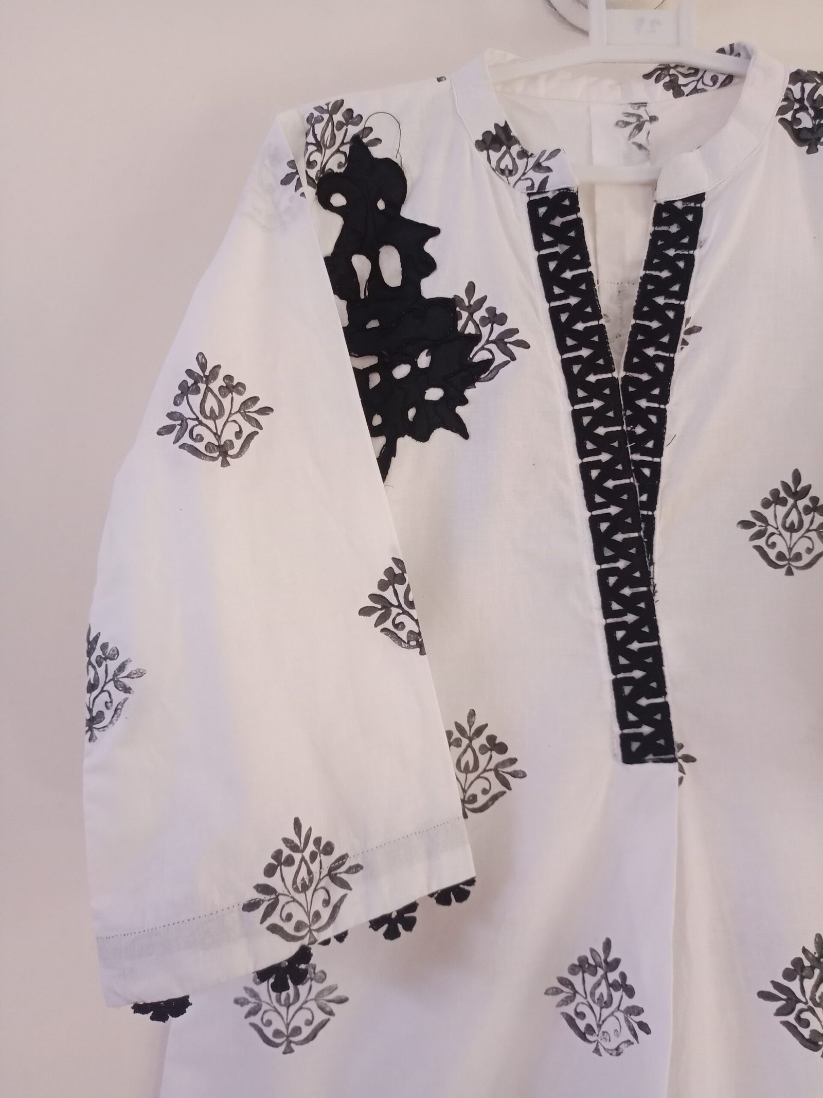 - Print: All-over black block-printed motifs arranged in a spaced, symmetric pattern. Each motif resembles a stylized floral or leafy element enclosed in a diamond-like shape.