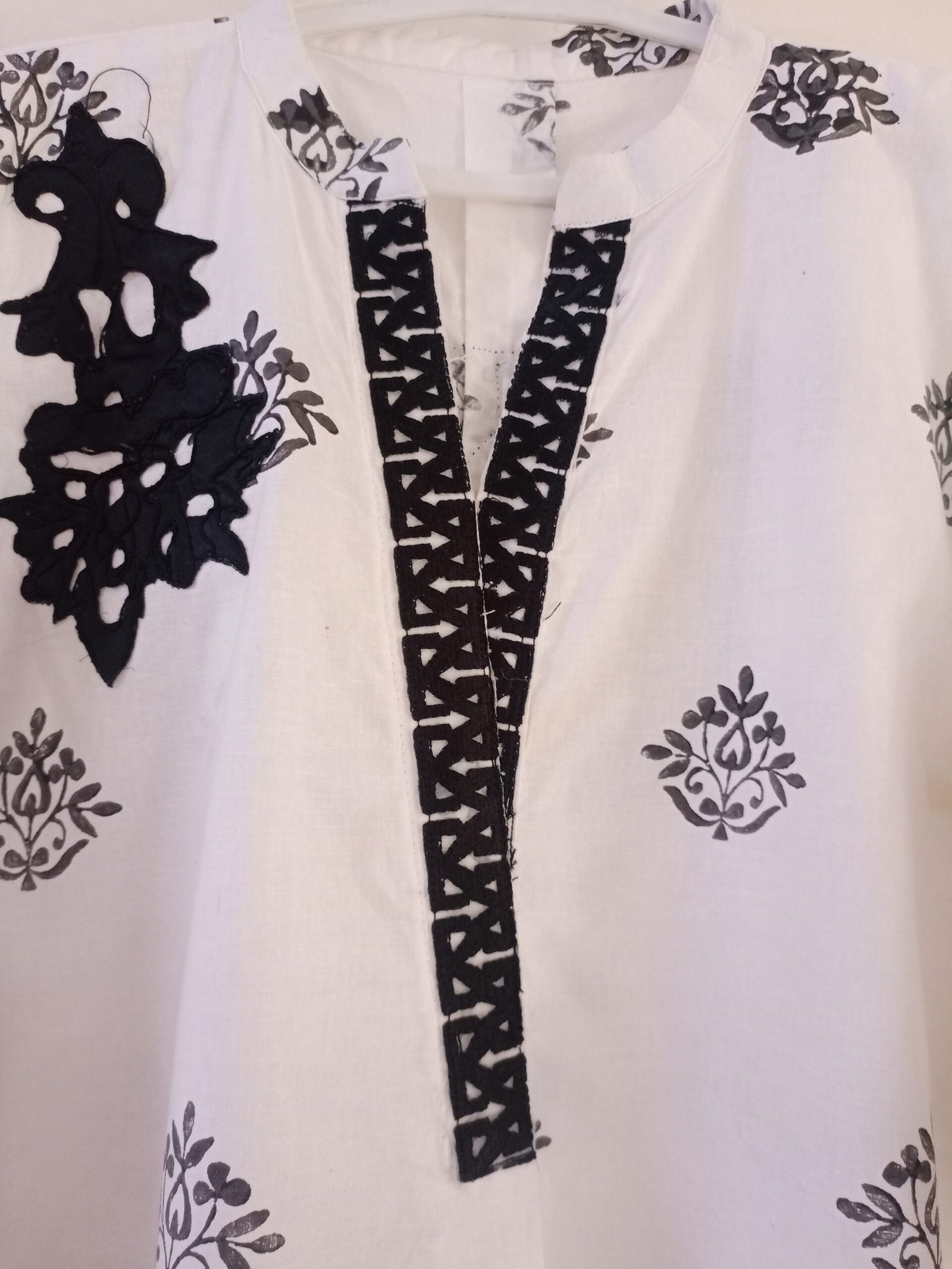 - Sleeve ends and side hems are bordered with a fine line of black lace detailing.