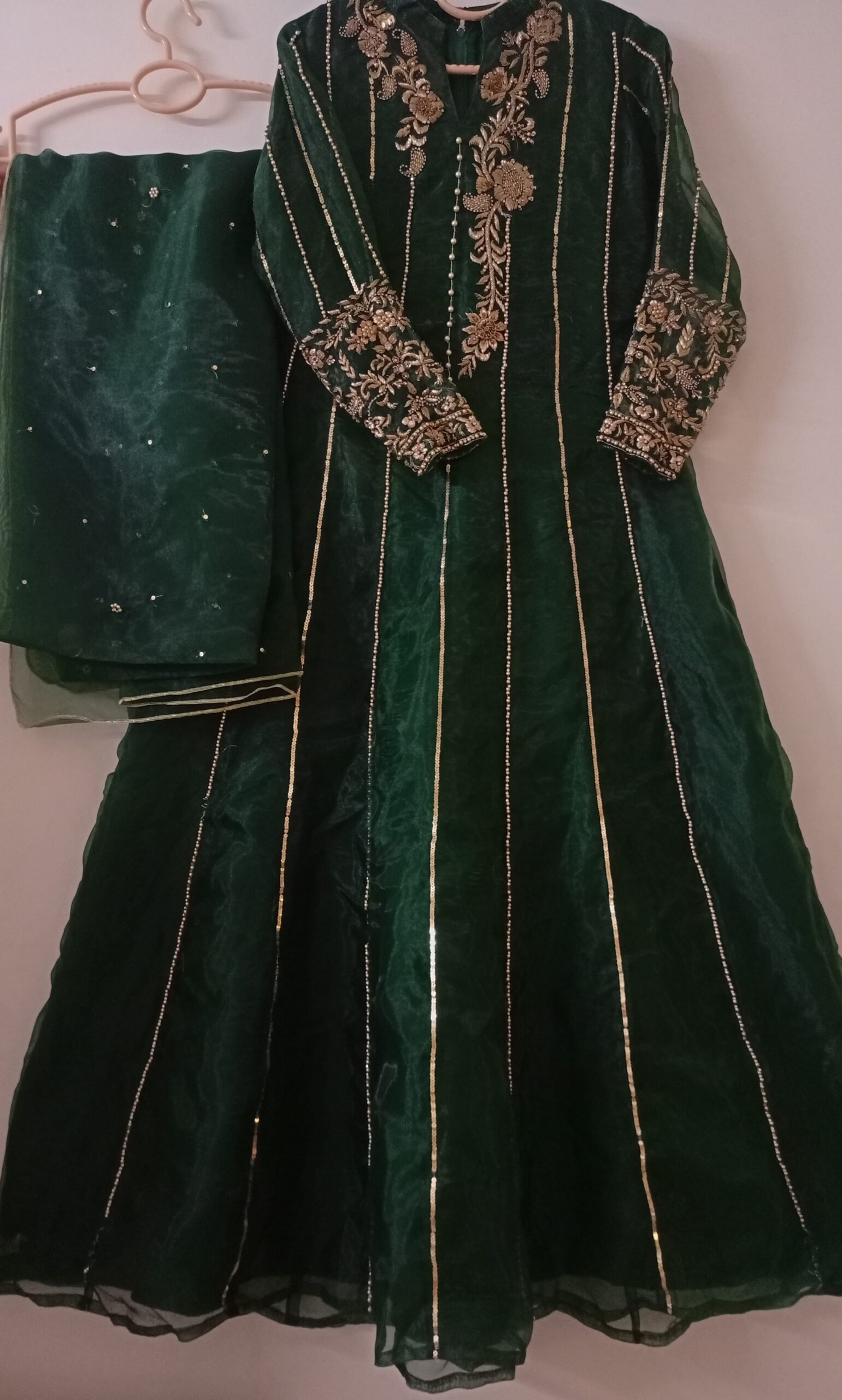- Dupatta: Matching green with light sequin embellishments scattered across it.