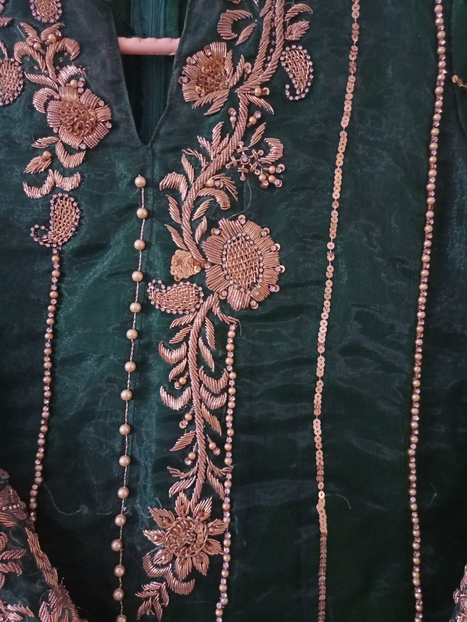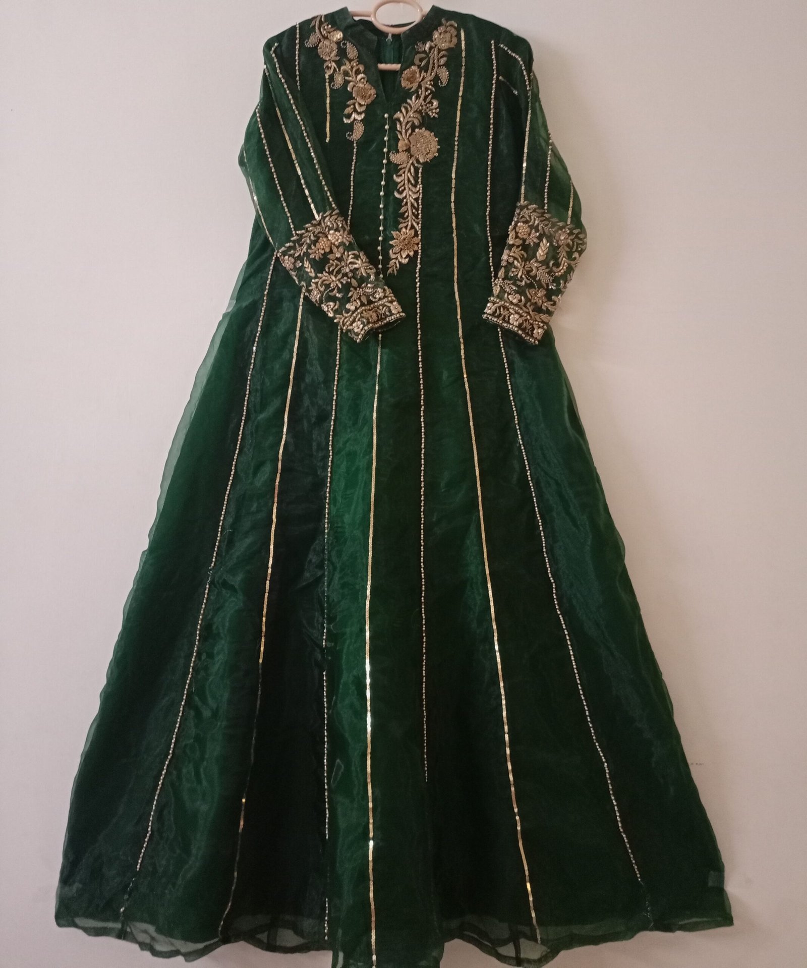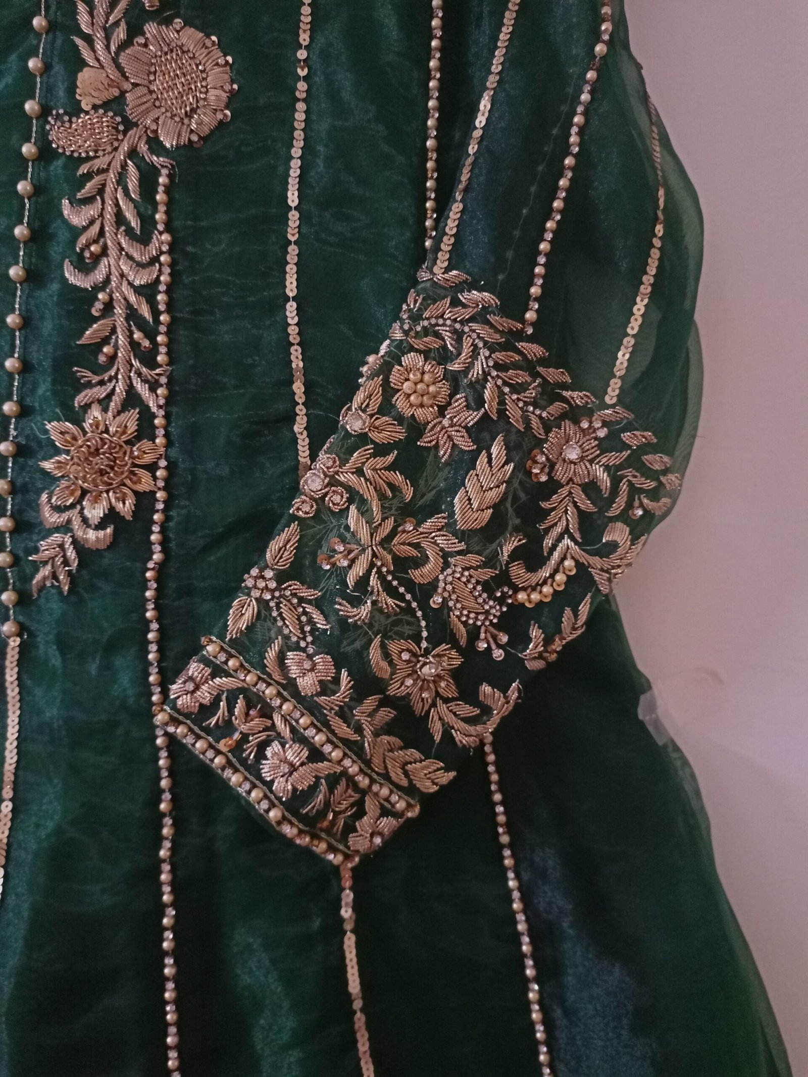 - Dense embroidery on the sleeves and neckline area, with vertical sequin lines running along the length of the dress.