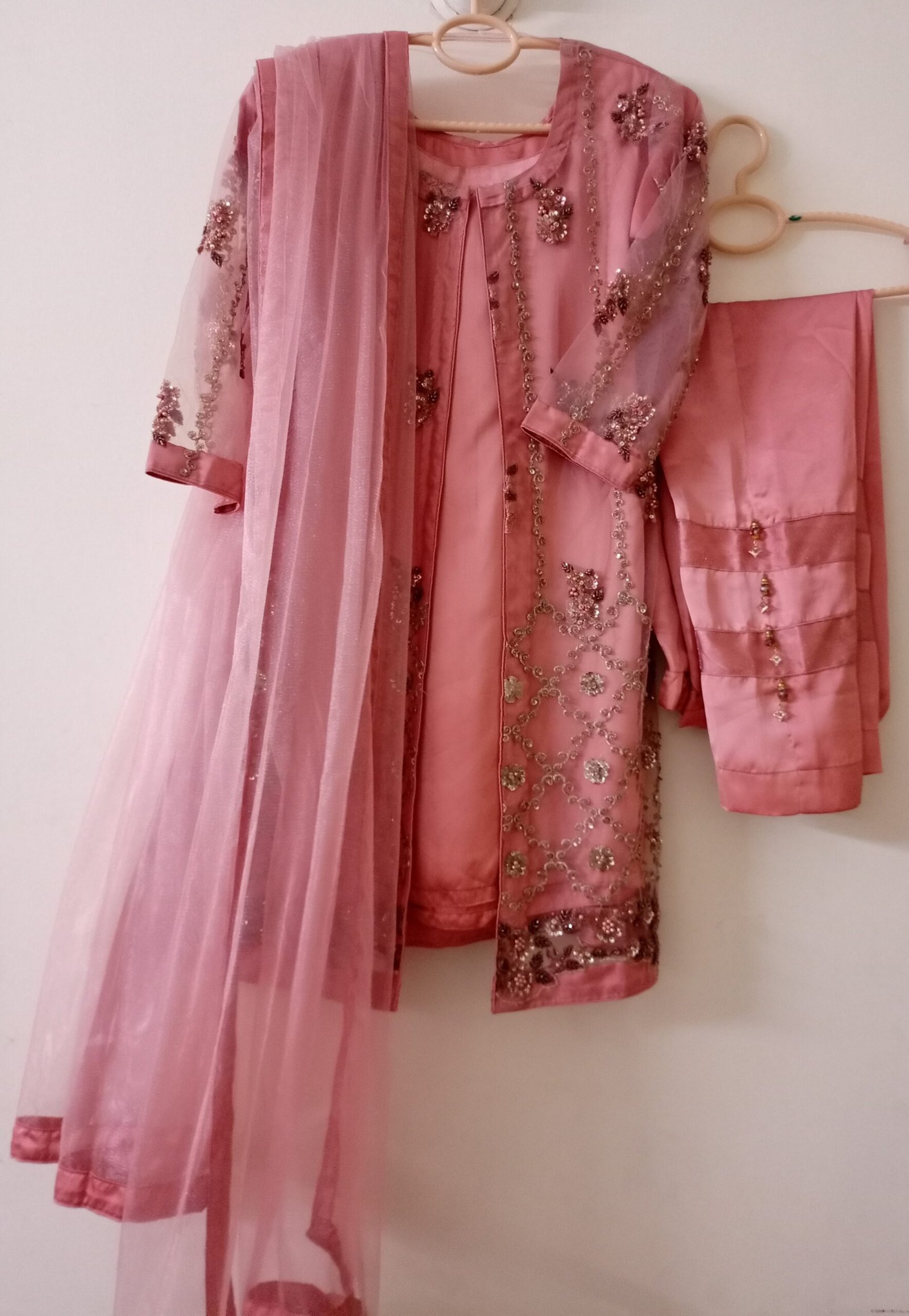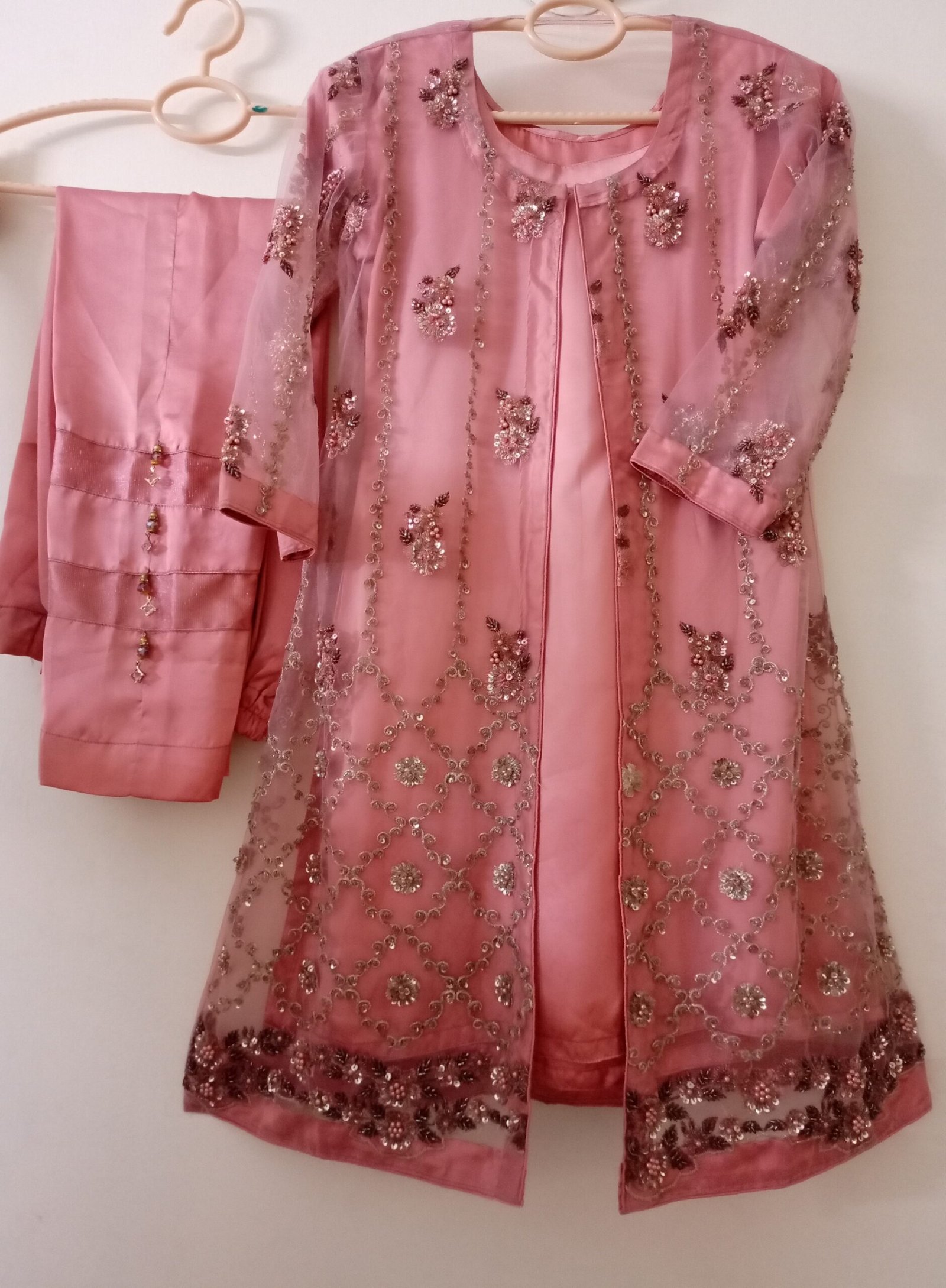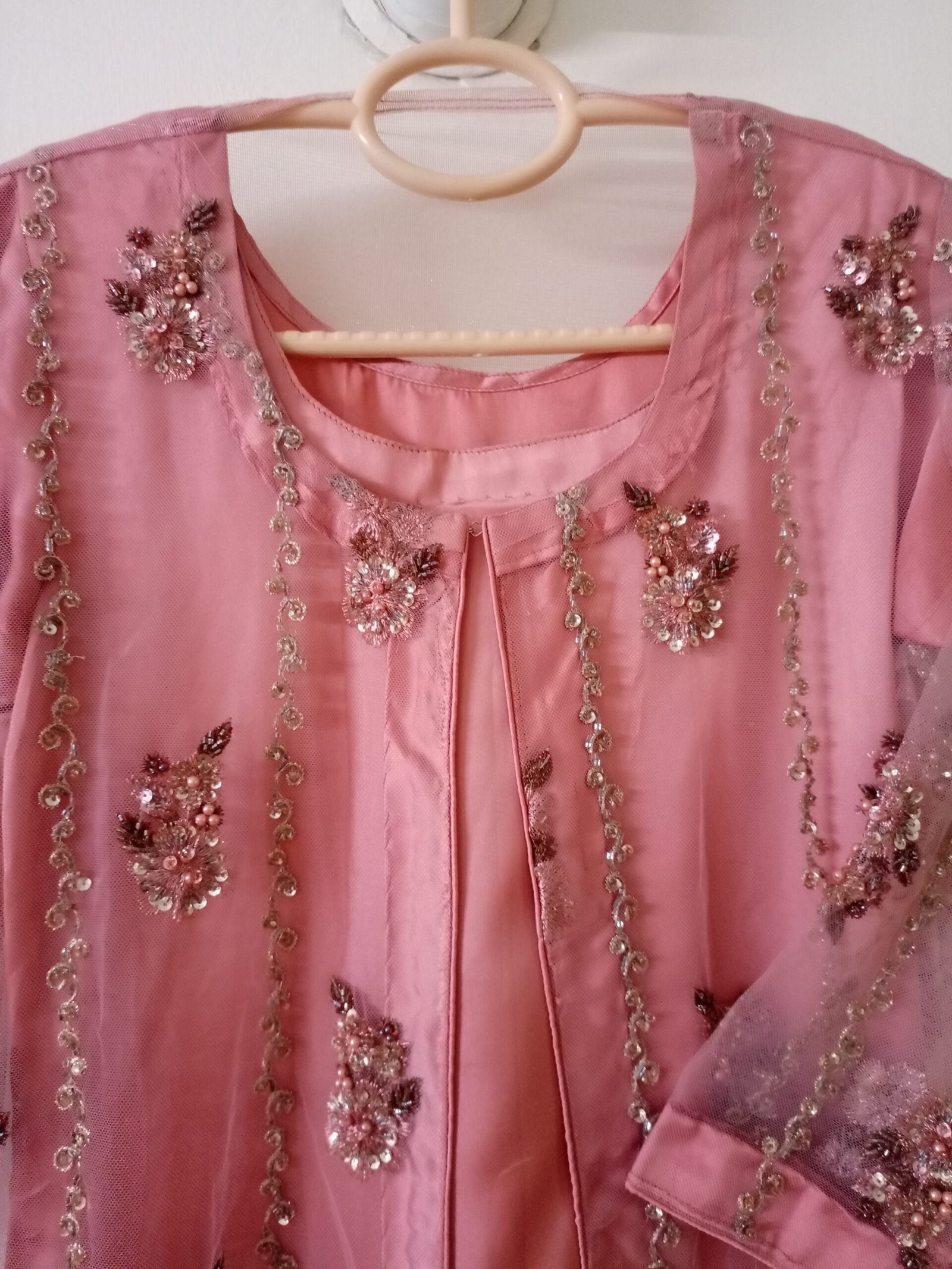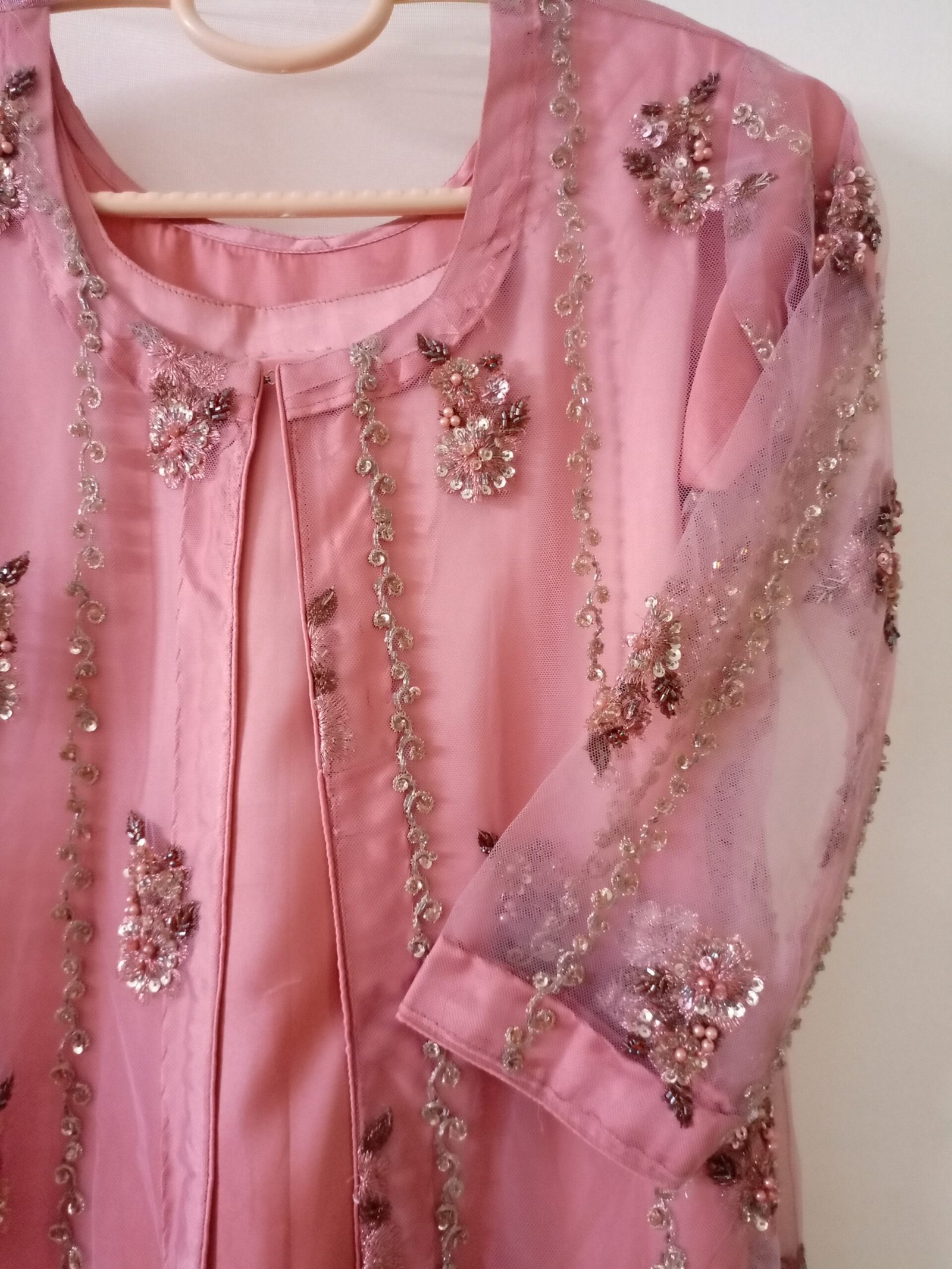 This exquisite ensemble features a rich rose pink hue with a graceful satin-like finish, lending it a luxurious and sophisticated appeal. The shirt is adorned with a delicate net overlay embellished with hand-sewn floral motifs and fine sequin embroidery in shades of pink, champagne, and bronze. The intricate detailing continues on the front panel and sleeves, enhancing the ethereal charm of the outfit.
